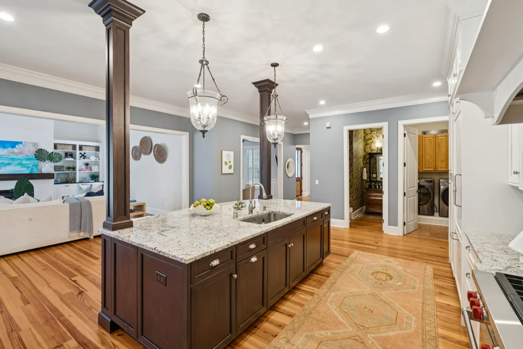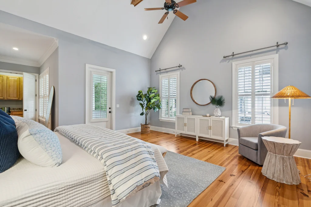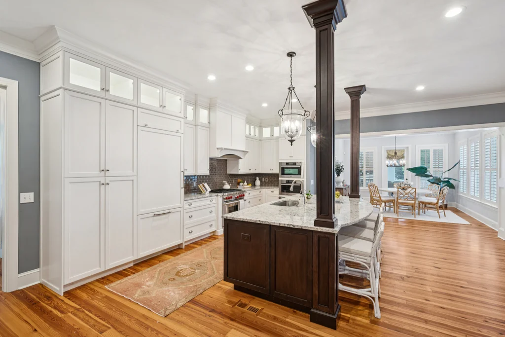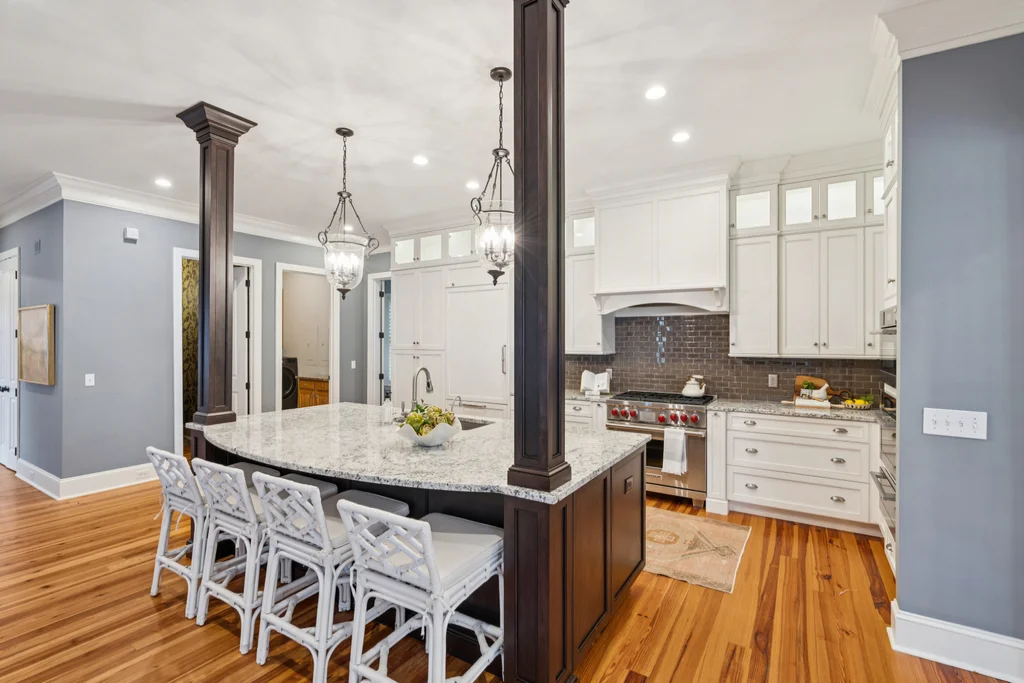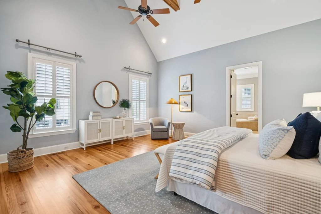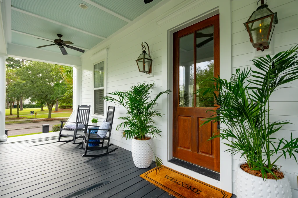 Welcome to timeless Charleston elegance across from Smythe Park. This custom-built home by New Traditions showcases classic Lowcountry architecture with Charleston-green porches, copper gutters, and a bluestone entry framed by moss-draped live oaks. Recent updates include a new roof and freshly painted exterior. Inside, heart-of-pine floors and natural stone counters complement an updated gourmet kitchen with high-end appliances, a Wolf 6-burner range, and Miele built-ins. The open layout offers expansive dining and entertaining spaces, and each bedroom includes its own en suite bath for privacy and comfort.Enjoy park and lake views from multiple porches and gathering areas. A fully equipped apartment above the garage provides additional flexibility for guests. With its refined craftsmanship, walkable location, and enduring curb appeal, this home embodies the best of Daniel Island living classic, convenient, and beautifully maintained.